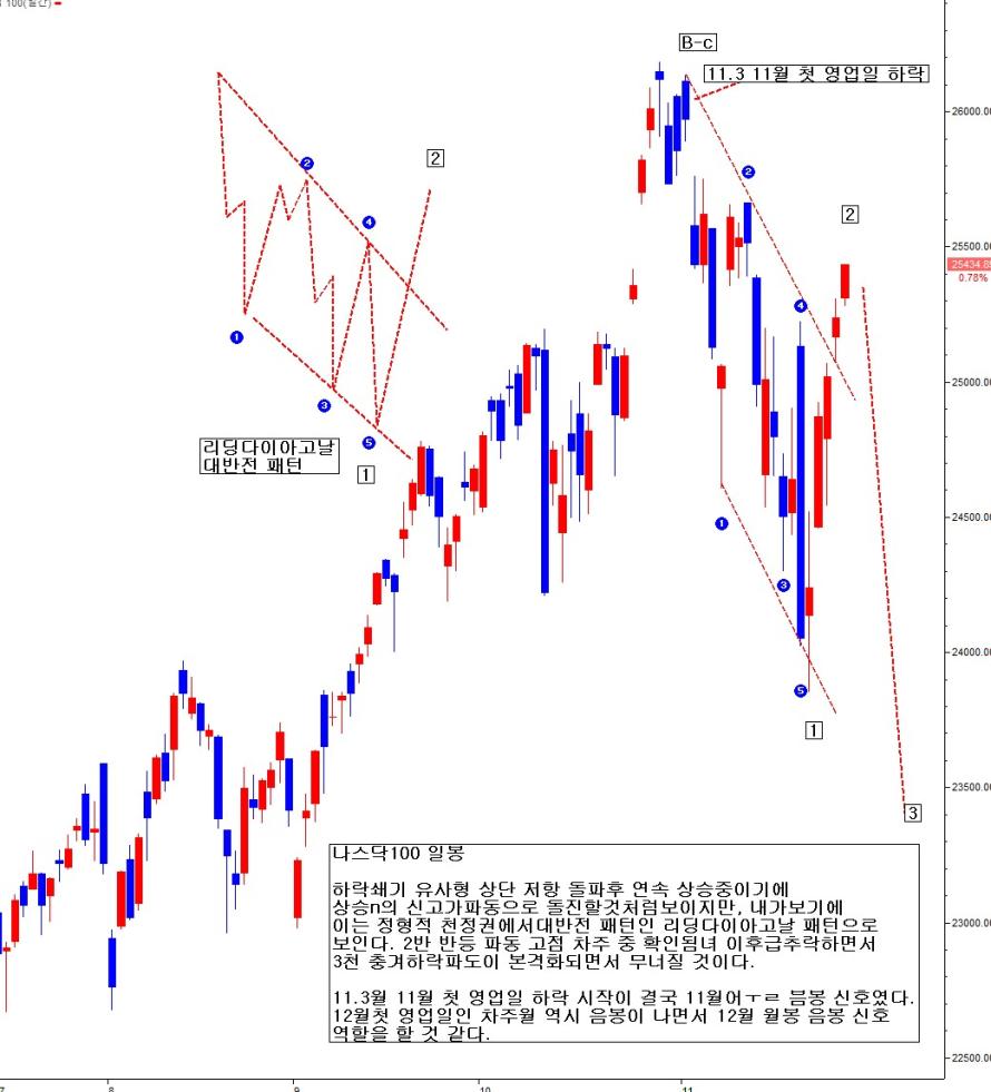 상승n파동 다시 시작한 것처럼 보이게 만드나, 분석자가 보기에 이 패턴은 리딩다이아고날 대반전 패턴으로 보인다. 금 음봉이 3번 충격하락 파동 시작 신호 같다. 차주 초반 미 증시 상승 연동 갭상승 후, 12월 첫 날부터 시가 고가 장대 음봉으로 무너지면서, 리딩다이아고날 패턴의 공포를 실감나게 만들 것 같다. 이 패턴이 맞다면, 미제 무관 추락 가속할 수 있다. 내부적 수급도 엉망이고, 기술적 패턴도 공포 패턴이다. 차주 주말 미제 상승이라고 결코 낙관할 일이 아니다. 개인적 과거 경험으로 이런 패턴에서는 미국 무관 패턴 완성되면, 폭락하였다. 지금 현재 L.D.P 패턴 완성이다. 차주 무너질 것 같다