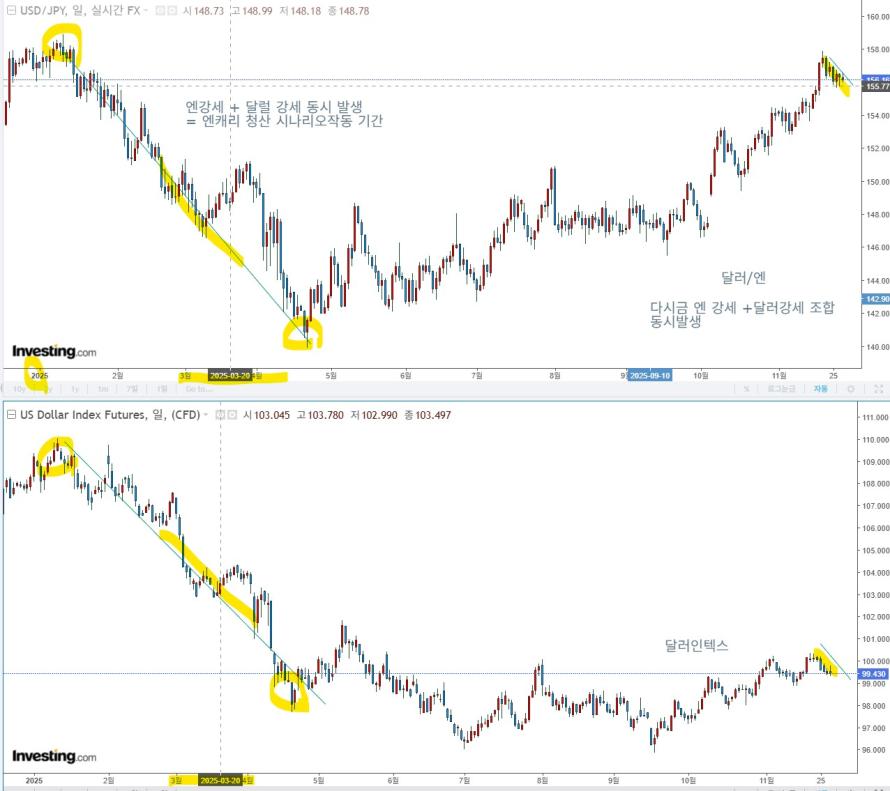 달러 약세와 엔 강세가 동시에 발생하고 있음에 대하여....(제2의 엔캐리 청산 시나리오 작동 가능성 고조)
