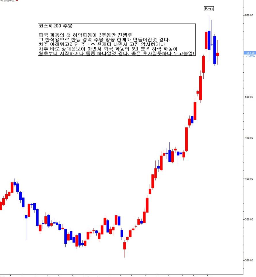 파국 파동의 첫 하락파동이 3주 동안 진행 후, 그 반작용으로 반등 성격 주봉 양봉 한개가 만들어진 것 같다. 차주 아래 위 꼬리 단 주봉 십자봉 한개 나면서 고점 암시하거나, 차주 바로 장대 음봉이 나면서, 파국 파동의 3번 충격 하락 파동이 월초부터 시작하거나 둘 중 하나일 것 같다. 촉은 후자일 듯하나 두고 볼 일!