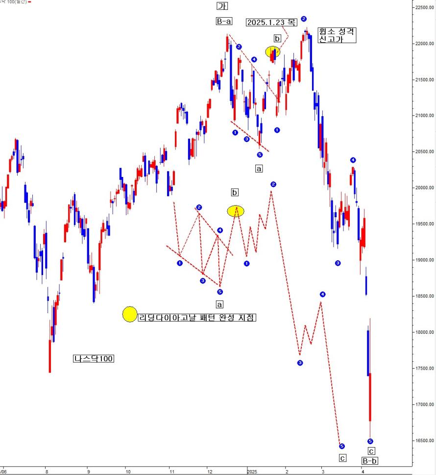 리딩다이아고날 완성 후, 3차 충격하락 파동 시작 신호가 금 음봉 성격이라면, 차주 미제 등락 무관 종가 기준 수직 추락 가속할 수 있다. 과거 이 리딩다이아고날 패턴 과정에 그러하였기에....