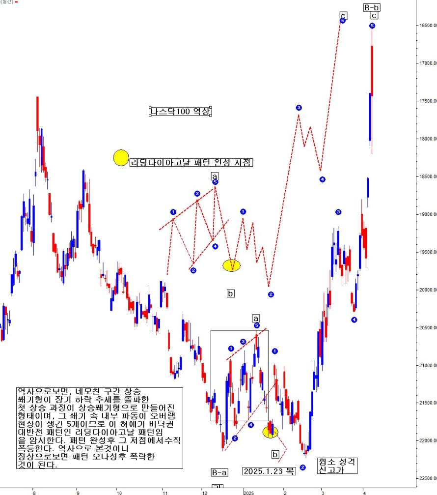2025.1.23 전후 진행 과정에 휩소 파동 신고가도 있음으로 인하여, 상승n 진행 도중의 눌림 교정 과정이지, 리딩다이아고날 패턴이 아니라고 반문할지도 모르겠다. 그런 경우 역상을 보면 답이 나온다. 역상으로보면, 네모친 구간 상승쐐기형이 장기 하락 추세를 돌파한 첫 상승 과정 성격으로 만들어진 형태이며, 그 쐐기 속 내부 파동이 오버랩 현상이 생긴 5개이므로, 이 형태가 바닥권 대반전 패턴인 리딩다이아고날 패턴임을 암시한다. 패턴 완성 후 그 저점에서 수직 폭등한다. 역상으로 본 것이니, 정상으로 보면, L.D.P 패턴 완성 후 폭락한 것이 된다.