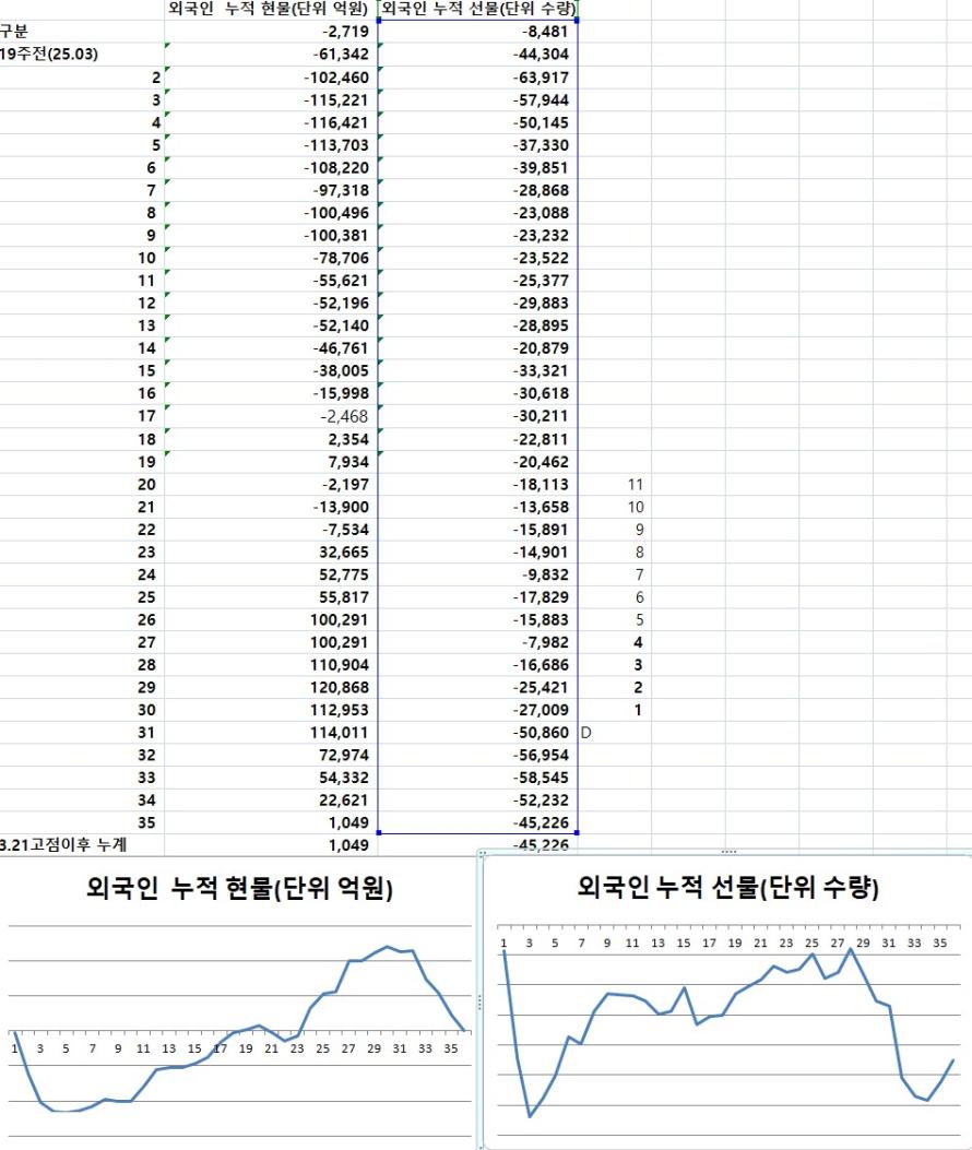 25.3.24이후 거래소 현 선물 누적 주간 양이 매매 동향 추이