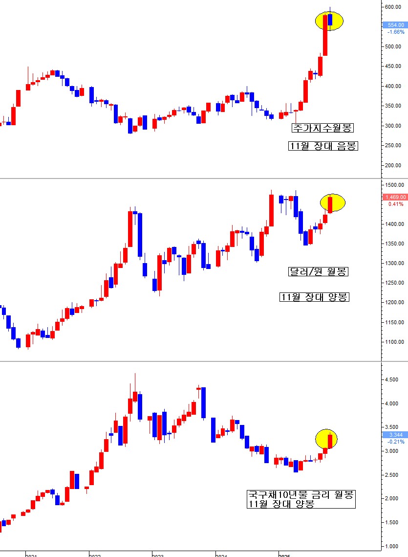 11월 내내 월간 금리 상승은 더 가속하고, 달러/원 환률은 더욱 치솟으니, 주가 지수가 비로소 겁을 내면서, 그 경고 신호를 받아 들이면서 11월 음봉이 남에 일조를 하였다. 2025.11월 한국 경제는 지금 심각한 위기 국면에 진입하고 있음을 내포하고 있다. 이 위기 조짐은 아래의 팩트가 동시에 나타남에 기초한 판단이다.