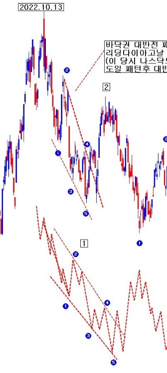 1번과 4번이 오버랩 + 쐐기 내부 파동이 1 내지 3개로 구성 = 리딩다이고날 대반전 공포 패턴 암시