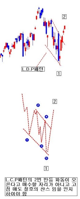 L.D.P 패턴이란 상승 추세 말기에 1차 첫 하락 파동의 형태가 하락쐐기형의 형태가 만들어지는 경우를 의미한다. 천정에서 이 패턴이 발생할 경우, 인간 뇌 구조의 인지의 오류로 인하여 위험 신호를 인지하기가 극히 어렵다.