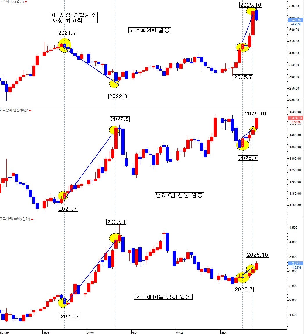 이와 동일한 현상이 2025.7-2025.10월 기간에 환 시장과 국채 시장에서 동시에 발생을 한다. 그런데 주식 시장은 동 기간 수직 폭등을 한다. 경제 상식에 기초한 이성적 반응이 아닌 비이성적 반응으로 볼 수 있다. 한국 증시 경제 역사상 환 시장과 금리 시장이 동시에 급등하면서 경고 신호를 보냄에도, 종합지수가 이렇게 사상 최고점으로 기록적으로 수직 폭등한 적은 단 한번도 없었다. 지난 7-10월이 처음이었다. 이상 현상이었다는 의미이다. 이 이상 현상은 지속할 수는 없다. 어느 시점 시장에서 그 과함을 급속히 교정하는 시점이 온다. 그 시점이 2025.11월 현재이다.