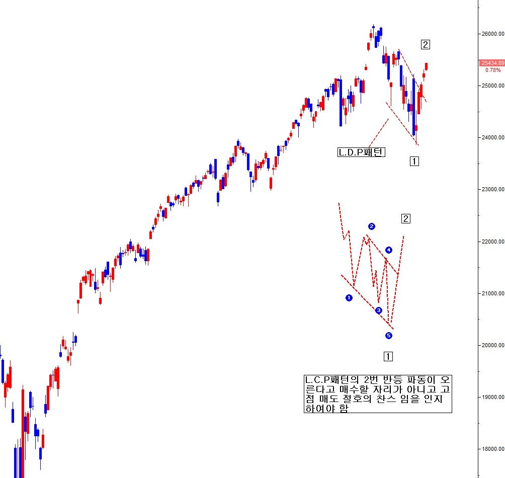 위 과거 SP500 L.D.P패턴 내 상승쐐기형 첫 상승 과정 후 2번 하락 과정이 지나고 보니,천행의 매수 기회였듯이,지금 현재 나스닥100 일봉 L.D.P패턴 내의 하락 쐐기형 첫 하락 과정 후 2번 반등 과정이 지나고 보면, 천행의 고점 매도 기회일 것이다.