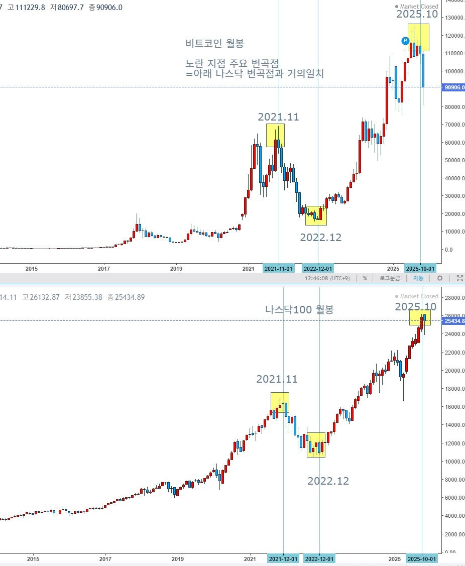양자의 월봉 주요 변곡점 시기가 거의 일치한다. 월봉 상으로 양자의 장기 변곡의 방향은 아래 3곳의 노란 네모 친 지점에서 완전히 일치한다. 다만, 그 변곡 이 후 추세의 강도와 등락 폭은 상당한 차이가 있다. 코인 가격이 나스닥 비하여 더 크고 가파르게 움직일 뿐, 그 변곡 시기는 월봉 상으로 거의 시차가 없다. 일봉으로 미세하게 보면, 약 한 달 정도 코인이 선행하여 움직인다고 볼 수도 있는 것 같다. 2025.10 양자가 동시에 사상 최고점을 만든 이후, 그 고점에서 동시에 하락하면서 11월 월 음봉이 난 상태이다. 양자 모두 변곡이 된 상태로 볼 수 있다. 과거를 거울로 하면, 변곡점 이후 양자는 동일 방향으로 하락할 확률이 높다. 11월 코인이 월 기록적 대음봉으로 약 -20%이상 폭한 점을 거울로 하면, 11월 나스닥100지수 고작 -1.67%의 하락이 부자연스러워 보인다. 양자의 상관성과 코인의 선행성에 기초하면, 이 부자연스러움을 12월에 교정할 확률이 존재한다. 즉, 11월 비트코인 -20%이상 대폭락이, 12월 나스닥100지수의 미래를 내포함일 가능성이 있다는 것이다.