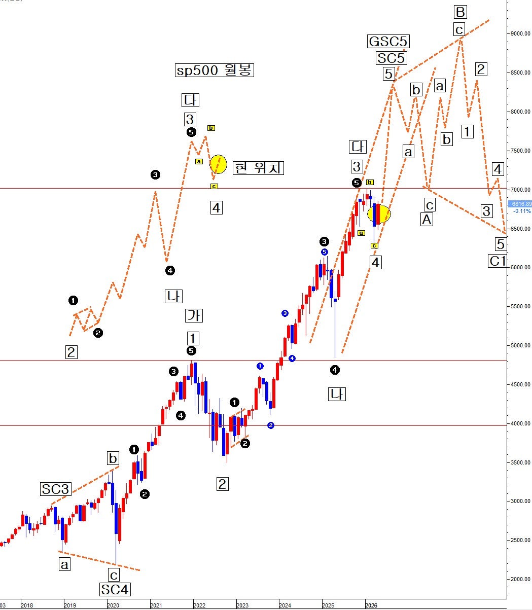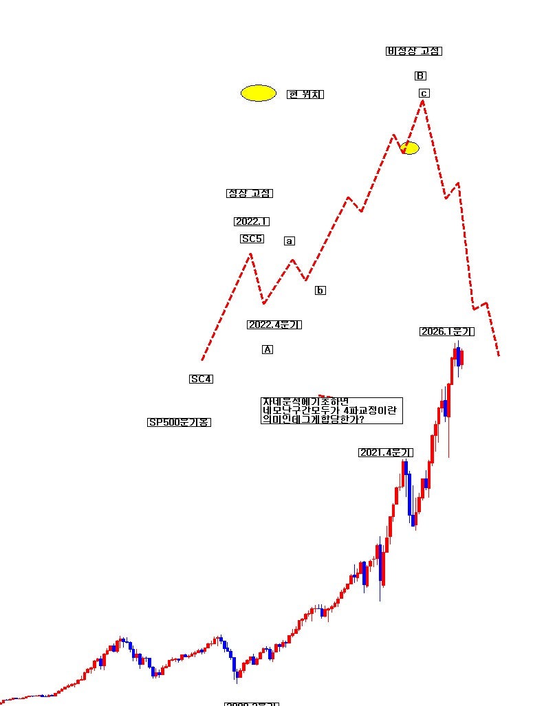 그림1 나스닥 분기봉 새로 추론한 강세론적 관점 장기 파동 구조에 연동하여 SP500 월봉 파동구조를 재추론 하여 본다. 기존 약세론적 관점에서는 가 고점을 SC5고점으로 보았다. 그 고점에 약 1년간 상당한 규모의 추락 파동을 하락A이라고 보았다. 그 저점에서 가 고점을 돌파하는 거대한 신고가의 연장 파동 전부를 비정상 반등B신고가 파동이 연장 구조로 진행되는 상태로 보았다. 고로 abc 3개의 마디가 연장 구조로 종료 후 무너질 경우 그 월 음봉이 하락C파동 시작일 것으로 추정하였다. 그런 상황이 여러번 발생을 하나 다시금 신고가가 나면서 재차 연장 구조로 가 버렸다. 이번에 또 그럴 조짐을 보이고 있다. 그림3처럼 SC5번 파동이 12345로거대하게 연장되는 구조로 고려하여 보지 않음은 아니었다. 그런데 그 시점 나 저점이 가 고점을 하회하였다는 점에서 SC5번이 상승N 12345 5개로 연장되는 구조로 봄에 파동 원칙에 위배가 되었다. 그래서 아무리 신고가로 자꾸만 연장이 되어도, 그는 비정상반등B 신고가 파동일 확률이 높다고 보았다. SP500으로는 나 저점이 가 고점 위에 있기에 나 저점을 SC5-2번 저점으로 봄이 원칙에 부합하나, 그 시점 다우30이나 나스닥종합지수는 나 저점이 가 고점을 하회 한 상태로 원칙에 부합하지 않았다. 그런 연유로 종합하여 보면 그림3 구조 유사하게 SC5이 12345로연장되는 구조는 오류라고 보았다. 그런데 현 시점보면, 묘하게도 다 고점을 SC5-3번 고점으로 보면, 다우30 나스닥 SP500 모두 원칙에 부합하게 된다. 가 고점을 나 저점을 하회하는 부분도 문제가 안된다. SC5-3번 소파동 내 하위 파동 속에 나 저점이 포함되는 구조이기에 이는 가 고점을 하회하여도 원칙에 위배 됨이 전혀 아니다. 시간이 흘러서 원칙에 위배되는 부분이 없는 아래 그림3 구조로 비로소 보게 만든다는 의미이다.