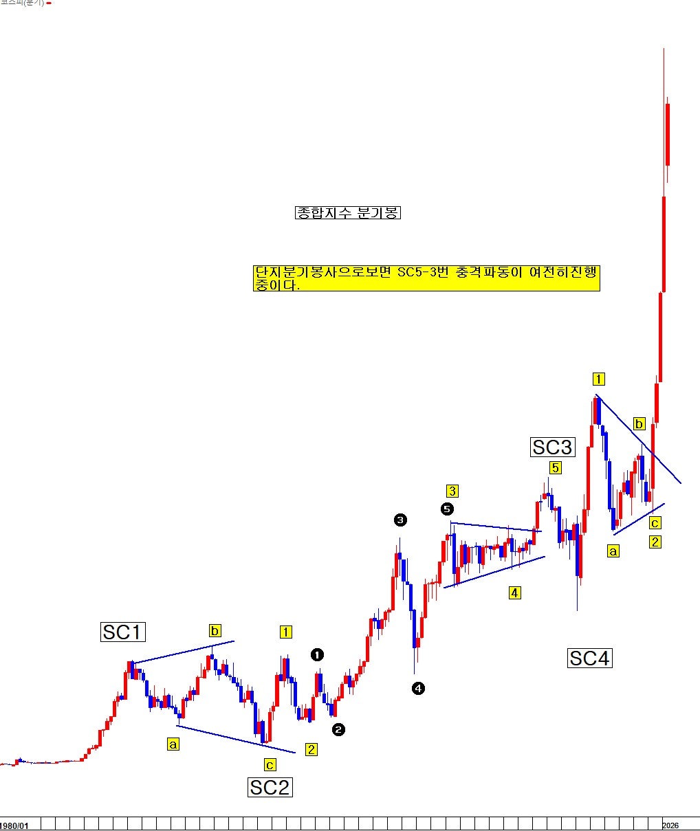 분기봉 음봉 시점을 하나의 마디로 보면, 2009.3월 저점에서 시작한 GSC5번 파동의 SC5번 상승 과정이 현재 진행 중이다. 연장 됨을 반복하면서.... 이는 분석자가 월봉을 보고 추론한 현재 장기 파동 위치와 전혀 다른 관점이다. 이는 인정하기 싫지만, 분석자가 큰 흐름으로 현재 국면을 크게 오판하고 있었다는 함의가 된다.