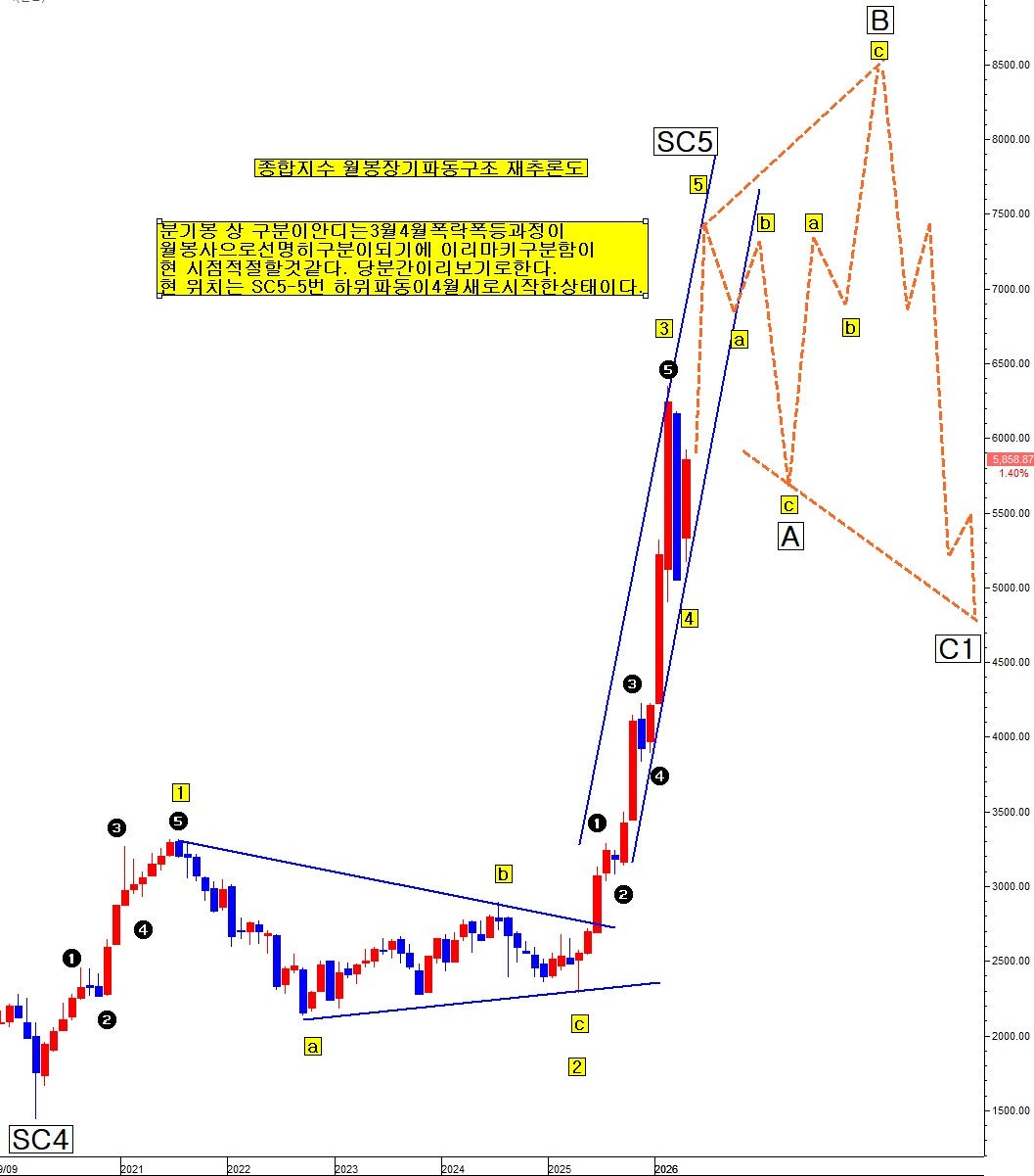 분기봉 상 구분이 안되는 3월 4월 폭락 폭등 과정이 월봉 상으로 선명히 구분이 되기에 이리 마킹 구분 함이 현 시점 적절 할 것 같다. 당분간 이리 보기로 한다. 현 위치는 SC5-5번 하위 파동이 4월 새로 시작한 상태이다.