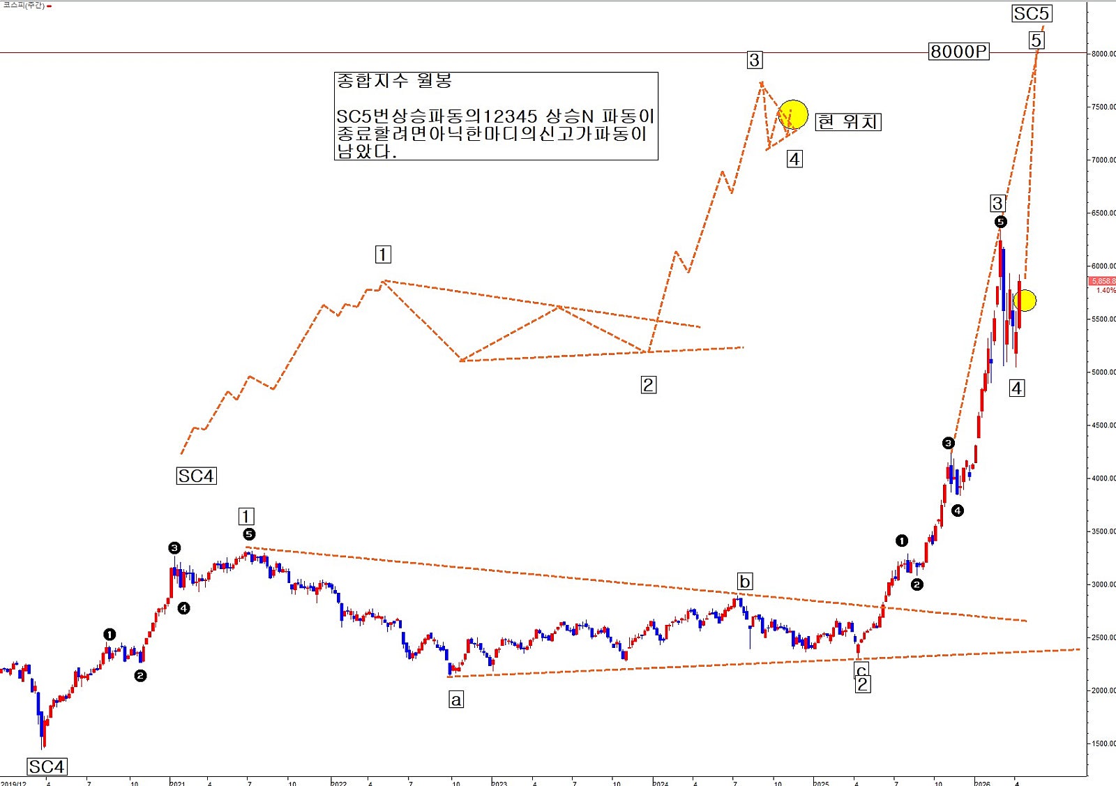 단지 분기봉 상으로 보면 SC5-3번 충격파동이 여전히 진행 중이다. 그러나 3번 상승 파동의 내부 과정을 월봉으로 좀 더 미세하게 보면 현 위치에 대한 다른 추론을 하게 만든다.