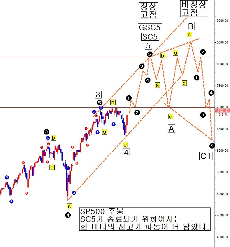 이 구조로 보면, 한 마디의 충격 상승 파동이 더 나와야 종료 조건을 충족하게 된다. 이는 신고가가 다시 남을 내포한다. 파국 파동이 온 줄 알았는데 이 구조로 보면 전혀 아니란 의미이다. 어느 시점 신고가의 SC5-5 고점이 완성이 된 후 하락A 추락 파동 abc와 비정상반등B 신고가 파동 abc 3개 나오면서 SC5-5 정상 고점을 돌파하는 신고가 파동이 또 나오고, 그 종료점에서 비로소 파국 파동(하락C)이 도래할 것으로 추정을 할 수 있다. 비정상 고점이 만들어 질 수도 있고 아닐 수도 있으나, SC5 충격 파동이 거대하게 연장에 연장 구조였기에, 이럴 경우 반등B파동이 신고가 형태로 비정상 고점을 만들고 파국 파동이 올 확률이 높다. 이 부분을 고려하면 코로나 위기 저점에서 거대한 장대한 상승 불구, 최종 비정상 고점까지 잔여 상승 여력이 아직도 상당할 가능성이 존재한다.