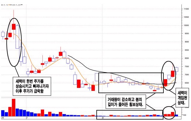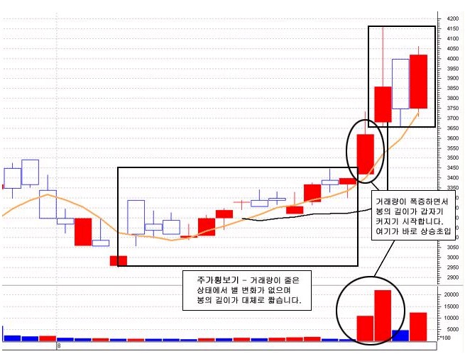 봉의 길이와 거래량의 증가는 세력의 가담을 의미한다