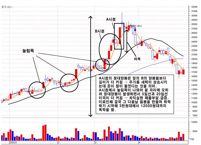 그러나 단기 급상승한 종목이 5일선과 20일선의 이격(간격)이 커졌음에도 밑의 그림처럼 눌림목을 주어야 할 자리에 오히려 장대양봉을 만들면서 5일선과 20일선의 간격을 더 벌리게된 경우 주가는 얼마 못가 꺽이게 되는게 일반적인 현상이다. 눌림목 없이 급등을 했기 때문에 급락을 할 가능성이 그만큼 커졌다고 할 수 있는 것이다.