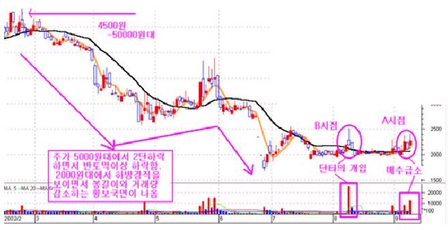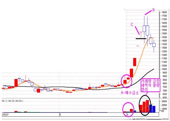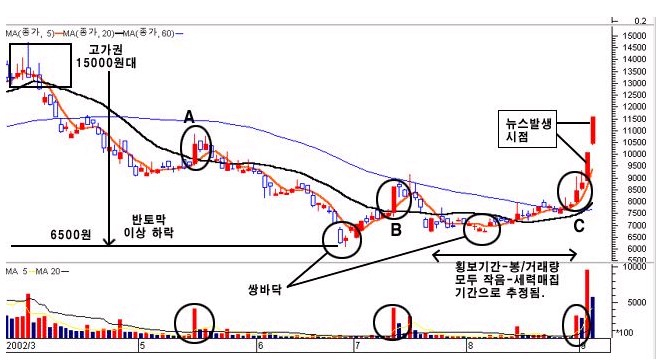 그 이유는 B지점의 봉길이 증가와 거래량 증가가 세력의 본격적인 주가상승 활동에 의해 나타난 것이 아니라 호재성 뉴스에 의한 단타성 매매자들의 개입에 의해 생겼기때문이다.