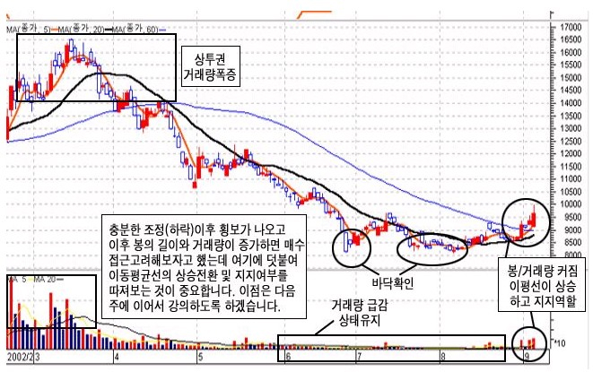 하락이후 횡보하던 종목은 횡보조정을 마무리하고 상승하려는 초입에 매수해야한다고 했습니다. 즉 횡보하는 종목을 미리 사지 말고 상승전환하는 것을 확인하고 사는 것이 안전한 투자법이라 했고, 상승전환한 초입이란 것을 알 수 있는 방법으로 봉의 길이가 커지고 거래량의 증가여부를 확인하는 것이 효과적이라 했습니다.