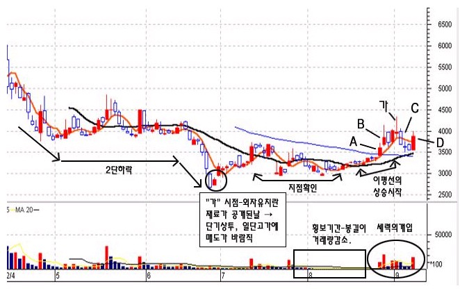 그러나 주가는 뉴스가 나오기 이전부터 움직였음을 알 수 있고 전 차트만 보고 해당 종목을 회원님께 언급을 했던 것이다. C지점이 A와 B와 틀린 점은 바로 충분한 조정을 거친이후라는 점이다. V자형 급반등을 제외하고 주가가 한번 크게 시세를 준 이후 세력이 다시 붙어 주가를 상승시키기 위해선 주가도 많이 하락해야 하며 다시 매집하기 위한 충분한 시간이 확보되야 한다고 할 수 있다.