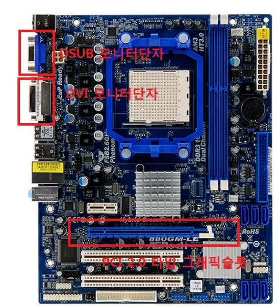 여기서 중요한것은 내장형 모니터 단자가 2개이상 있는 즉, Dsub, DVI 또는 HDMI 단자가 있는 AMD CPU의 메인보드를 선택해야됨.