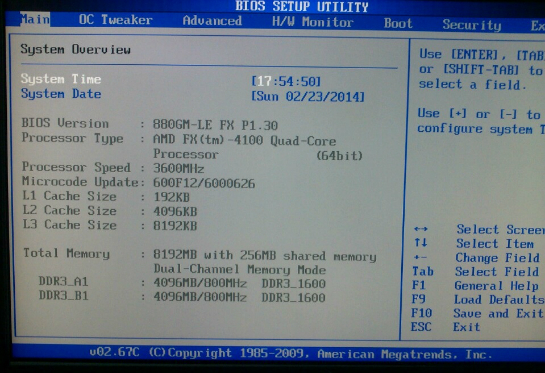 Main의 시스템 정보가 보이고, 현재 AMD FX 4100 쿼드 코어 CPU에 3600 MHz 프로세서 스피드 즉 3.6GHz