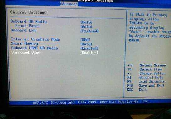 거기서 Surround View 기능을 Enabled로 바꾼 후 F10을 누르면 세이브된 후 롬바이오스를 끝내고 재부팅.