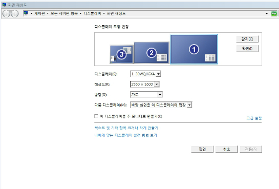 각각의 그래픽카드에 선을 연결한 후 재부팅 후 제어판 > 디스플레이 > 화면해상도를 보면 각각의 설정이 감지되어 모니터 3대가 연결되어 있음을 확인.