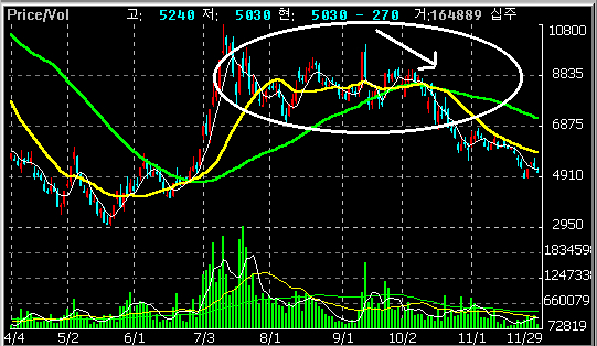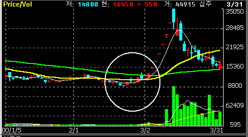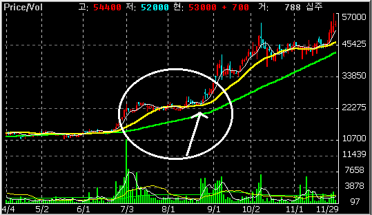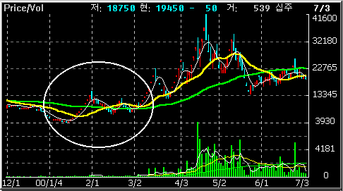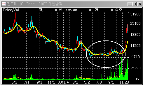 B-5. 실전 응용 차트(중간매집형 : 20일과 60일사이 5일선 쌍바닥 : 동산진흥(31960))