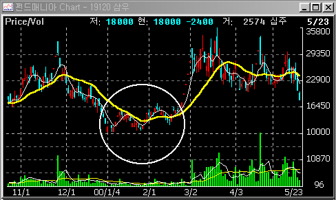 B-3. 실전 응용 차트(5일선 3중바닥 급등주 포착 : 삼우(19120))