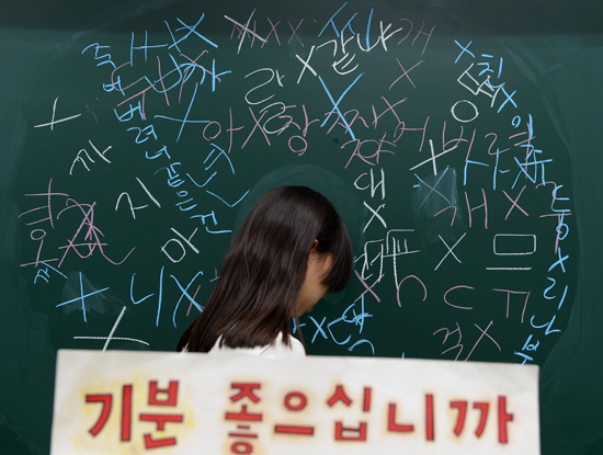 ↑ 서울 경희여중 학생들이 16일 학급 칠판에 또래들이 일상적으로 사용하는 욕설을 적어 보았다. 말하는 이는 무의식적으로 욕을 쓰지만, 듣는 사람은 상처를 받는다. 최흥수기자 choissoo@hk.co.kr