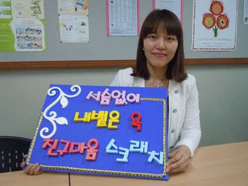 ↑ 학생 언어문화개선 선도학교인 충북 청운중학교 문수미 교사가 한 학생이 작성한 욕 근절 표어를 들고 있다. 청운중 3층 복도 '국어올레길'에는 학생들이 스스로 만든 우주 표어가 걸려있다. 김혜영기자 shine@hk.co.kr