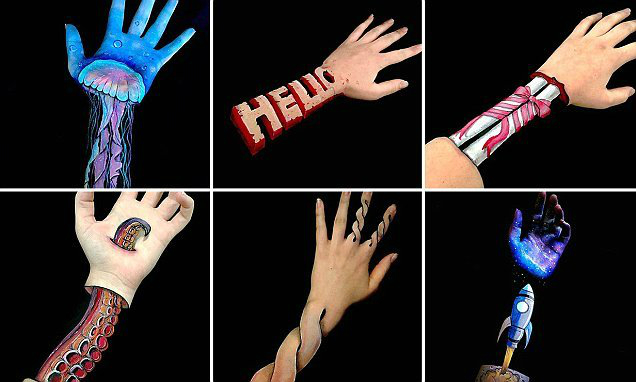 Lisha Simpson, 21, from Canberra, Australia, is an aspiring body artist who creates the amazing 3D artworks using colourful paint. The student, who has two sons Cooper and Oliver, creates incredible images of (pictured clockwise from top left) a neon jelly fish, a gruesome 3D greeting, an X-ray illusion, a space rocket, twisted limbs and spooky tentacles. She currently has 12,800 followers on Instagram and 958 people have liked her page on Facebook.