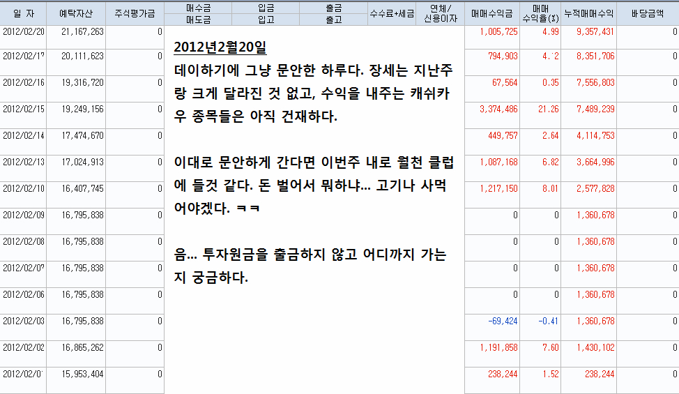 오늘도 순탄하게 거래하셨는지요? 점심을 걸러서 그런지, 2시 넘으니까 집중력 저하로 한두건의 거래를 삑사리 내기도 했네요. 하지만 대체적으로 양호한 하루였습니다. 날씨도 쌀쌀하던데 감기 조심하세요.