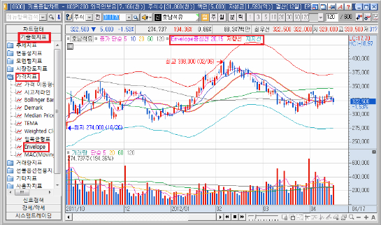 엔벨로프(envelope)는 봉투를 뜻한다. 일정기간 동안 주가의 평균에서 상하로 주가의 벌어진 정도(이격)를 표시하는 것이다. 차트에서 그 모양이 봉투처럼 생겼다고 해서 엔벨로프라는 이름이 붙었다.