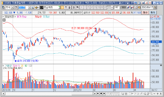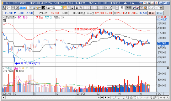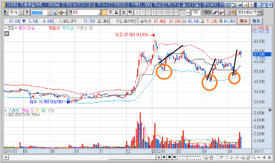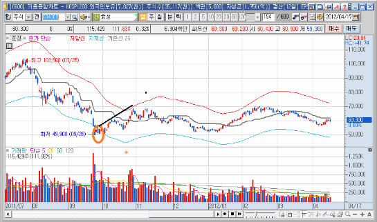 우량주는 고점에서 최악의 경우 반토막이 날 수 있습니다. 최악의 경우입니다. 이런 확률의 근거로 퍼센트가 위아래 합해서 40%의 하락을 보이면 바닥일 확률이 높다라는 근거에서 만들어진 겁니다. 추가적인 하락에 대비해서 분할매수라는 대비책을 마련해 두는 것입니다. 물론 회사의 부도설, 자금악화 등 회사의 존립에 심각한 문제가 발생한 경우에는 예외에 해당되겠죠. 이런 문제 없이 우량주가 일시적인 상황에 주가가 40%이상 하락하면 우량주는 반드시 제자리를 찾는다는 어떤 확률에 근거한 차트기법입니다. 우리는 일일이 모든 종목이 어느정도 떨어졌나 확인이 불가능하므로 이런 방법을 이용해 좀 더 쉽게 접근하자는 겁니다. 물론 조정이 길어지면 큰 인내력을 필요로 할 수 도 있습니다. 하지만 그 기다림은 항상 우리에게 보답을 해준다고 믿습니다.