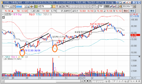 결론적인 상황에서 지금에서 보면 D구간에의 매수는 홀딩구간이라고 보여집니다. 기준선이 우상향하면서 그 중심으로 주가가 움직이고 있습니다. 물론 엔벨로프 상단에 근접했을때 매도하든 그런 대응은 사람마다 틀리겠죠.