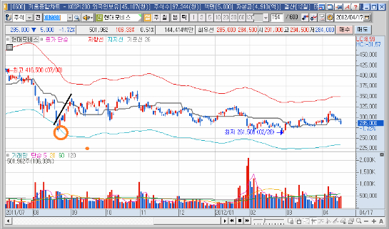물론 저는 지금 단타나 스윙위주로 매매를 하기 때문에 신경을 많이 쓰지는 않지만 그래도 항상 기준선과 엔벨로프를 염두에 두고 종목을 봅니다.여기에다 개인적으로 좋아하는 차트기볍을 추가로 해도 무방하지만(가령 5일선이 깨지면 50% 매도하고 10일선에서 나머지 물량을 매도하기 위해 이평선을 추가로 하는 방법) 여러가지 기법은 항상 고민에 빠지게 하고 혼란을 주는 경우가 더 많습니다. 자신한테 맞는 방법 1,2 가지를 완전히 자기 것으로 만든후 원칙에 맞는 매매를 하면 분명 이 어려운 주식판에서 살아 남는데 큰 도움을 주리라 확신합니다.