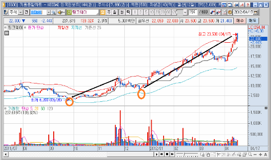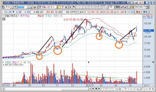 다음은 급등주인 안철수연구소와 EG입니다. 이건 결과론적으로 우연히 맞은 결과일 수 도 있습니다. 어디까지나 우량주일 경우에만 적용하는게 확률을 높이는 겁니다.