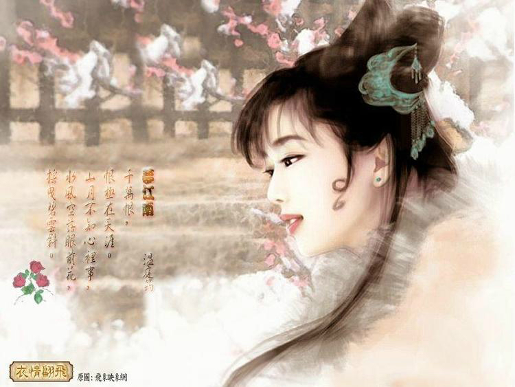당명황이 꽃을 부끄럽게 하는 그녀의 아름다움을 찬탄하고