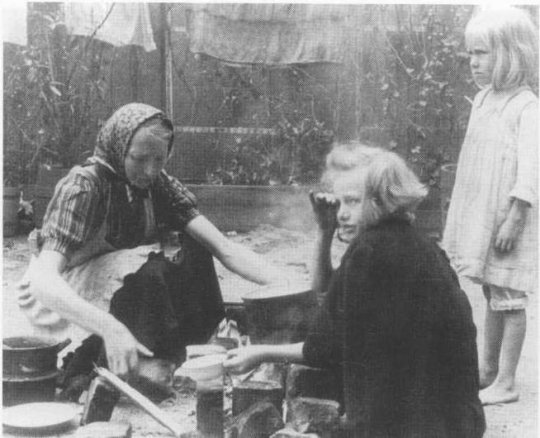 [소련군이 다가오고 있다는 소식을 듣고 어떻게 해야 할지 몰라 우물대고 있는 동프로이센 독일여자들, 어쩌면 저 중에 등을 보이고 있는 비교적 젊고 이쁜 여자는 '자신의 프랑스 애인의 보호'를 기대해서 도망가지 않는지도 모른다. 저 정도 미모라면? 당시 동프로이센에선 프랑스 남자 애인이 없는게 이상했기 때문에...! 하지만 이들도 곧 모든 걸 포기하고 도망가야 했다. 당연한 일이겠지만, 자신이 최대 4년간이나 몸과 맘을 다 바쳐 사랑했던 그 프랑스 남성들이 저희들을 전혀 사랑하지 않고 단지 육체만을 바란 바람둥이였다는 사실을 금새 깨닫게 되었기 때문이다. 누가 후진국 여자에게 진정한 사랑을 하니???~ 골빈 결혼한탕 욕심바란 후진국의 골빈 여자들아. 냉수 먹고 속 좀 차려라! 하긴 속차려도 이땐 이미 늦은 때가 아니었을까?]