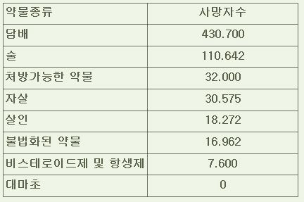 이 통계에 따르면 ‘사회적 해악’을 가늠해 볼 수 있는 사망자 수에 있어서도 담배와 술은 수위의 자리를 차지하고 있다. 반면에 대마초의 사용으로 인한 사망자수는 보고되지 않고 있음을 알 수 있다.