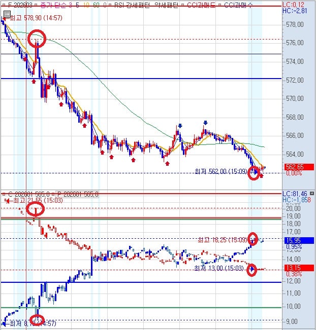 하지만 선물 추가 상승하지 못하고 하락하였고 양 572 고저가 바뀌면서 콜옵션 575 상대 장중저가이자 본인 전저 13.25