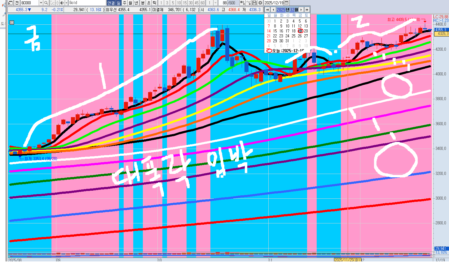 일봉캔들이 붙어서 양봉색많이 즉 조정없이 힘없이 상승해서 금개미들