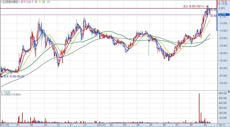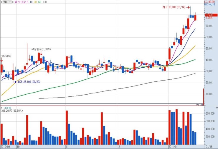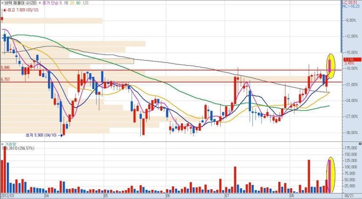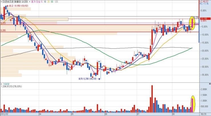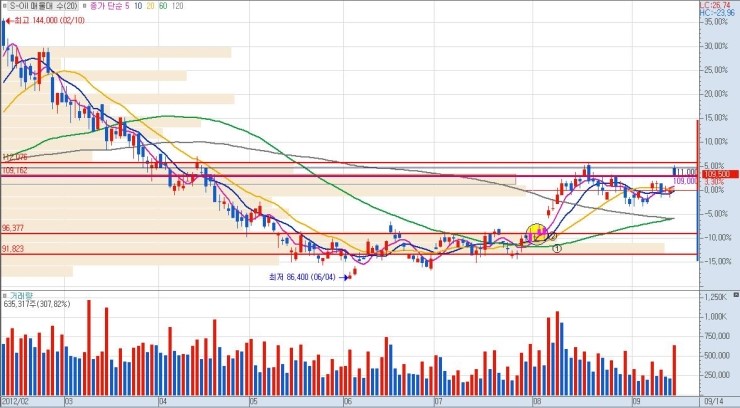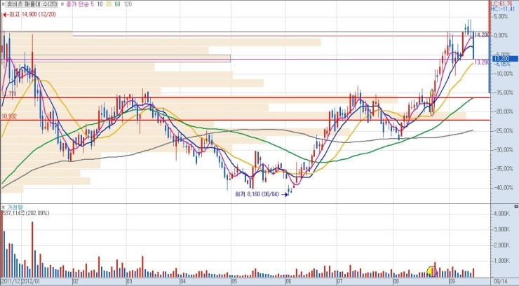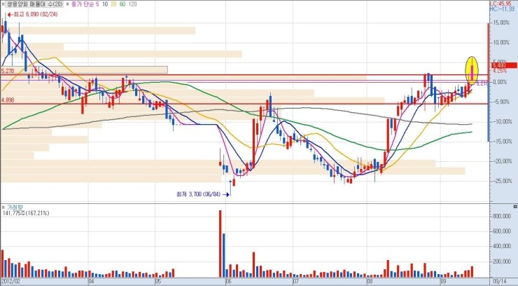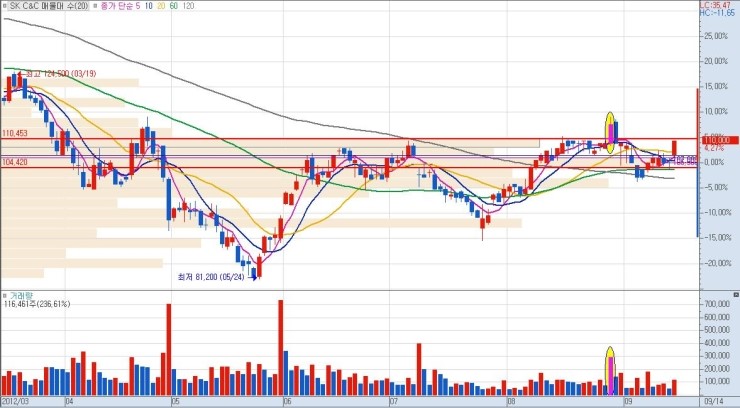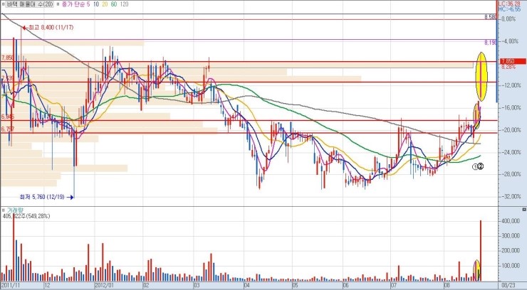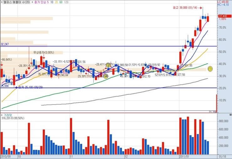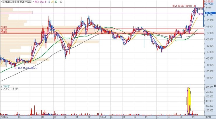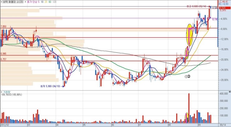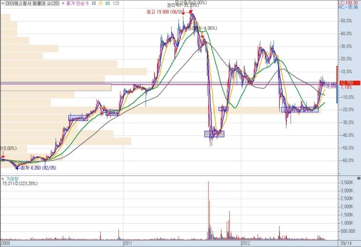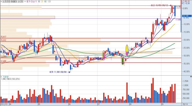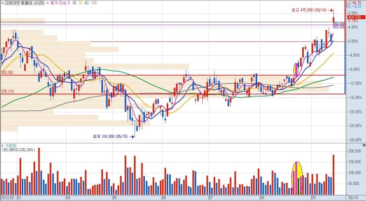 상단 매물까지의 구간 폭이 클수록 그만큼 큰 수익을 낼 수가 있으므로, 유리합니다. 단기적 급락 이후 매집 종목이나 역사적 신고가 최초 달성 종목이 이에 해당
