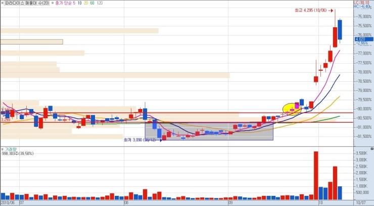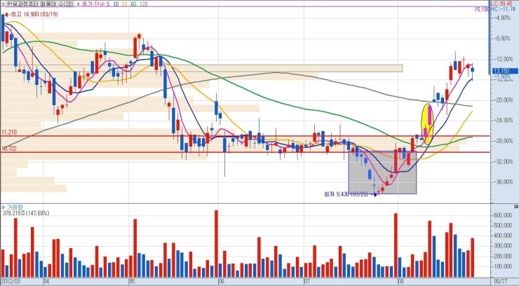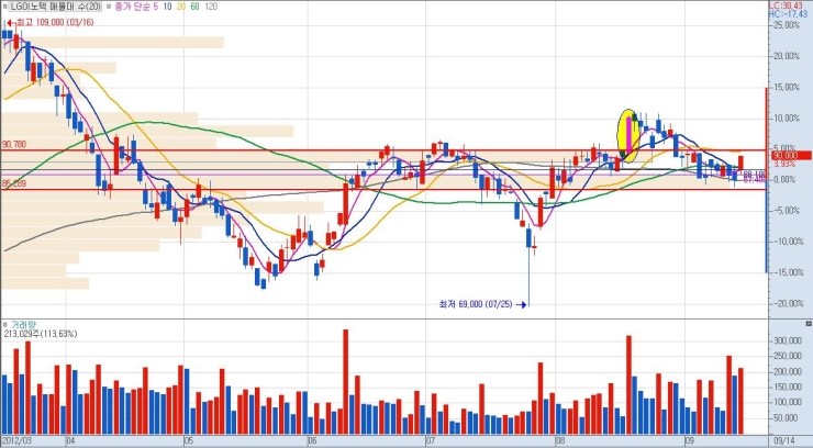 거래량과 매물대, 평평한 구간을 집중적으로 보시기 바랍니다. 그리고 주가의 움직임을 사선으로 올라가는 것으로 보