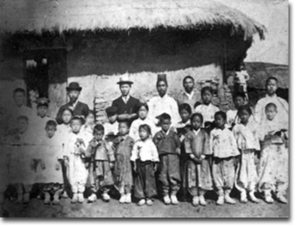황해도 장연에서 교육활동하시던 1907년. 맨 뒷줄 왼쪽에서 4번째 망건쓴 분 오른쪽이 선생