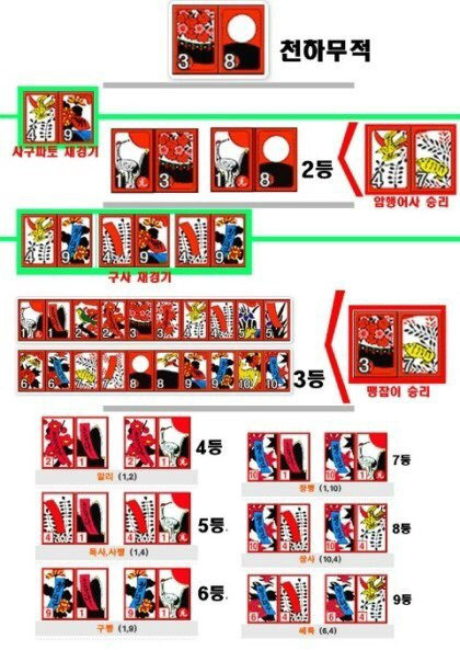 광땡 : 13광땡(1광과 3광의 조합), 18광땡(1광과 8광의 조합)이 있다. 당연히 38광땡도 포함된다. 광땡의 높낮이는 38광땡>18광땡=13광땡의 순이다.