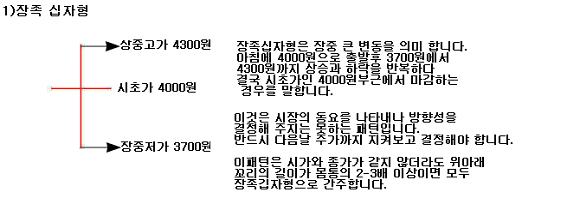십자형이 천정권에서 발생하면 매수세의 동요로 보고 조만간 추세전환을 예측해 볼수 있으나, 하락추세에서 발생하는 십자형은 추세지속으로 이어지는 경우도 많습니다. 십자형에는 장족십자형과 비석형 그리고 잠자리형이 있습니다. 이중 중요한것은 비석형과 잠자리형 이며 상당한 신뢰도를 가지고 있는 만큼 꼭 숙지해 두어야 합니다.