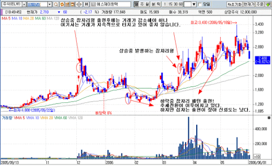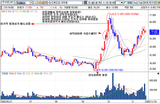 보통 상승추세에서는 지속적인 급등세를 기록하던 종목은 다음날 시초가가 강하게 출발하게 되나, 예상을 깨면서 높지않게 출발하는경우 단기적으로 매수세가 강하게 유입됩니다. 주가는 강력한 양선을 형성하며 또 다시 급등할것이라는 인상을 심어주게 되어 주가가 순식간에 급등락하며 개인을 유혹합니다. 그리고 개인이 따라오면 물량의 상당수를 정리하게 되어 주가의 상승탄력은 크게 줄어들게 되어 위꼬리를 길게 형성하게 됩니다. 이제 긴꼬리에는 개인들이 물려 있으니 기존세력이 주가를 끌어올리지 않는다면 주가는 다시 상승하기가 어렵습니다.