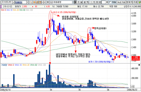 이것은 세력의 손바뀜(물량돌리기)이나, 남아있는 개인의 물량을 털때 자주 출현하는 패턴입니다.