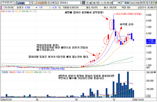 연속적인 상한가를 기록하던 종목이 대량거래와 함께 십자형 일봉이 출현했다고 하여 무조건 매도하게 되면 더 높은 수익을 올릴수 있는 기회를 잃을수도 있습니다. 십자형이 출현했다면 다음날 상황을 보고 매도해도 절대 늦지 않습니다.